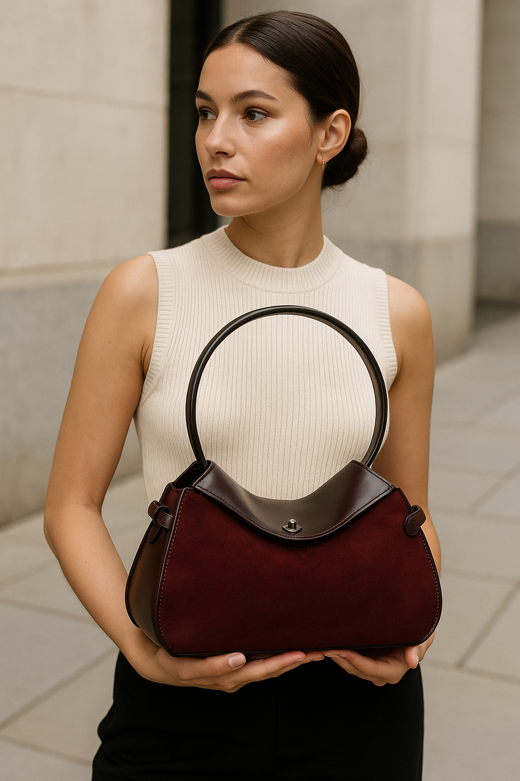 The Bordeaux Arc Bag – Sculpted Suede & Leather Top Handle